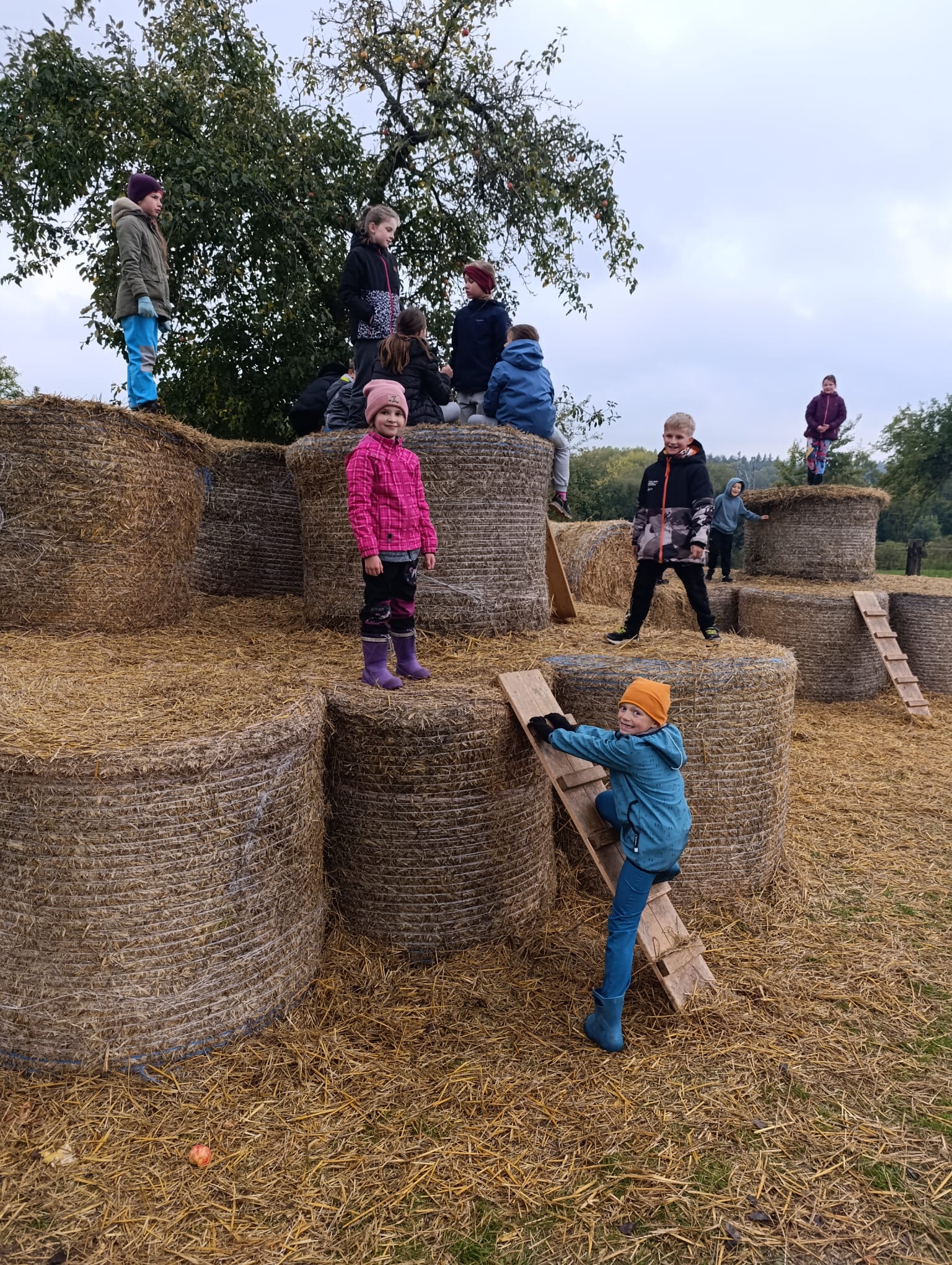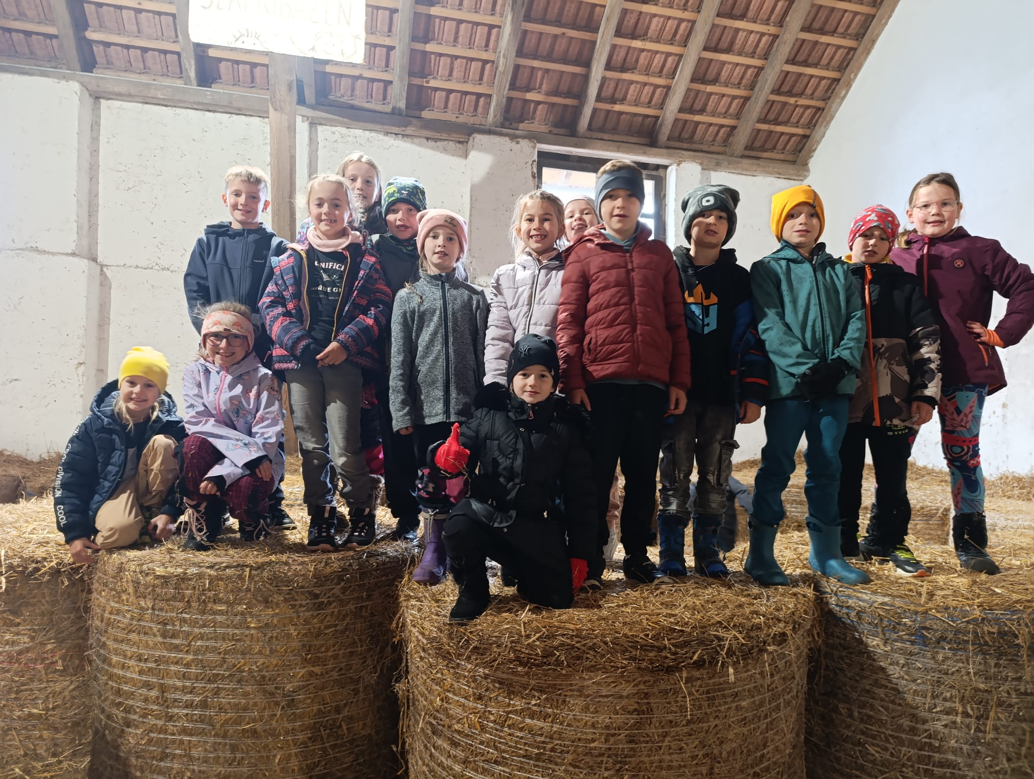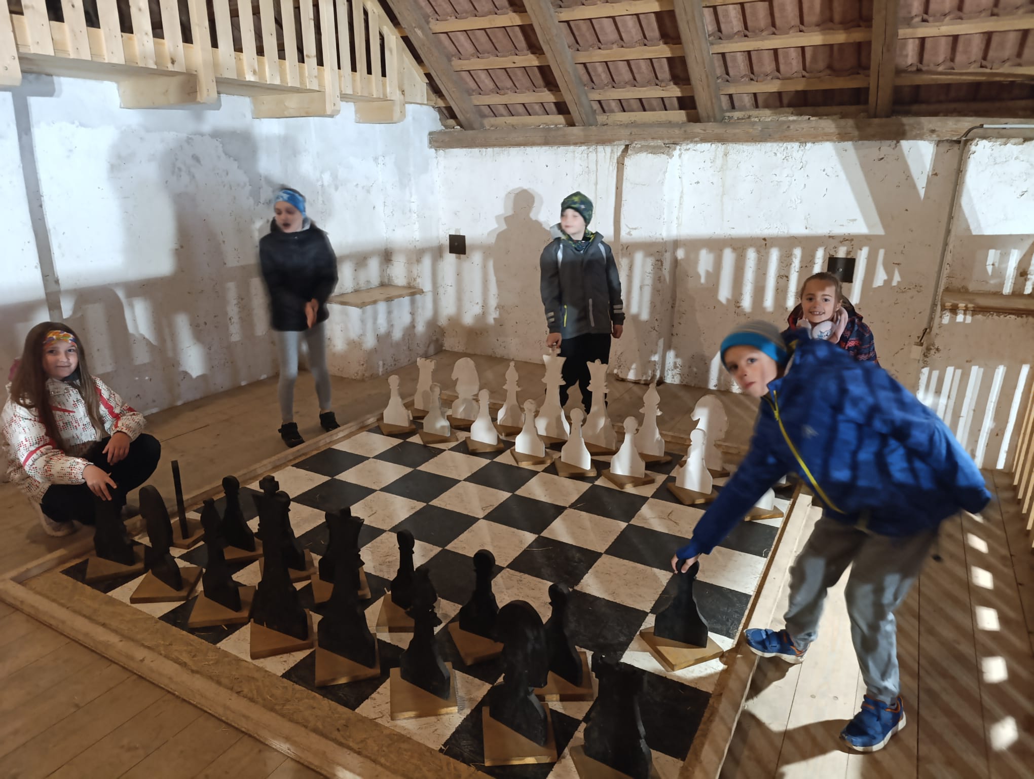 Ve stodole se děti nasvačily a s nadšením se pustily do různých aktivit - setkání s domácími zvířaty, hraní maxi šachů, koupání ve slaměném bazénu (Ten byl nejlepší! :-))