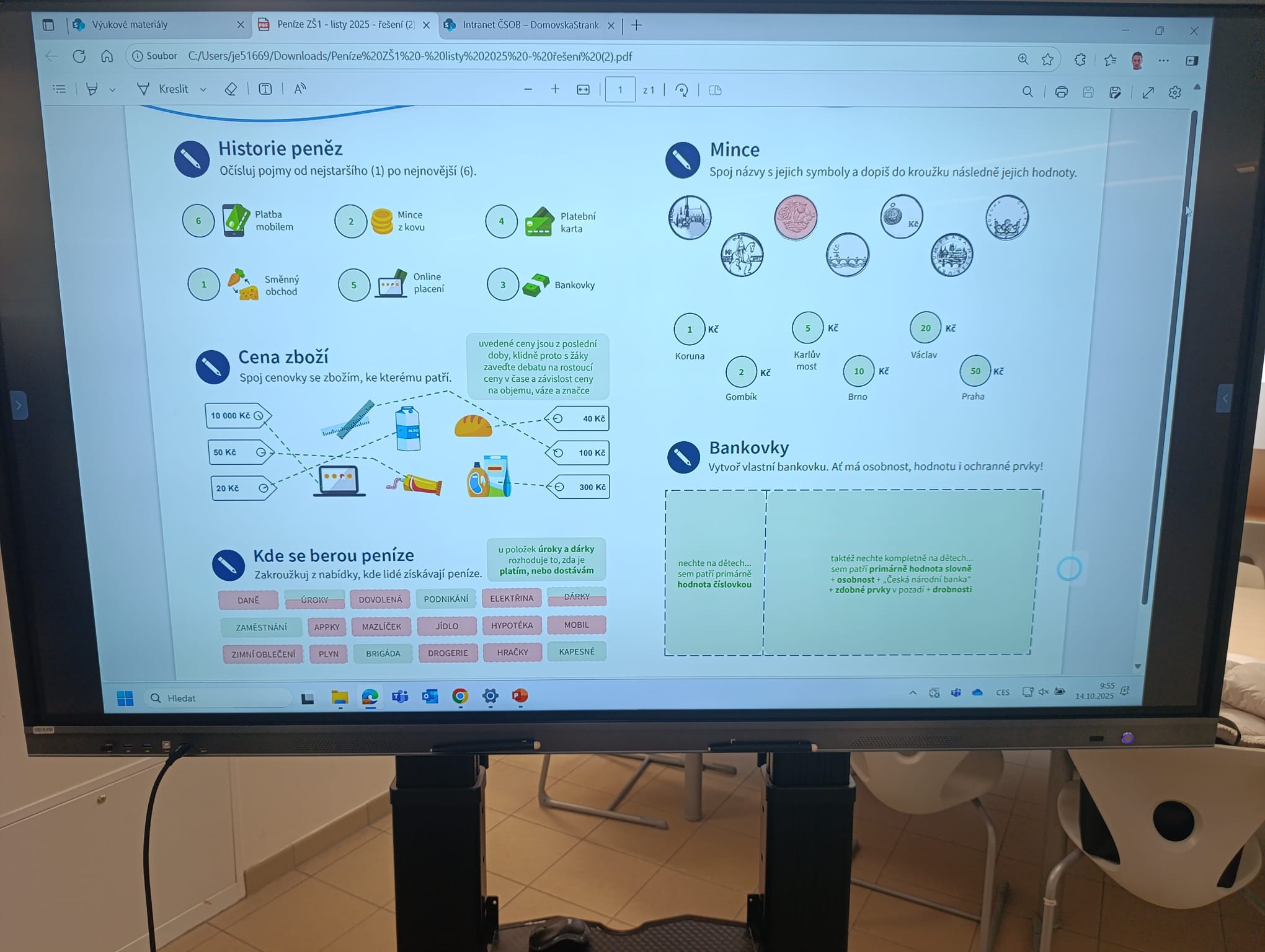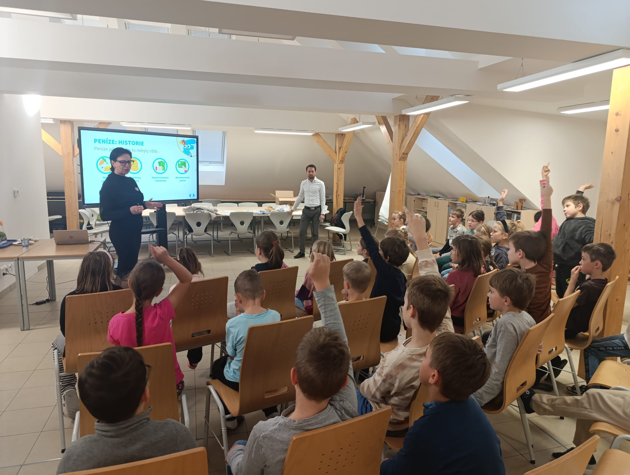 Při interaktivní besedě s pracovníky finančních institucí si žáci připomněli směnný obchod, peníze dříve a nyní.