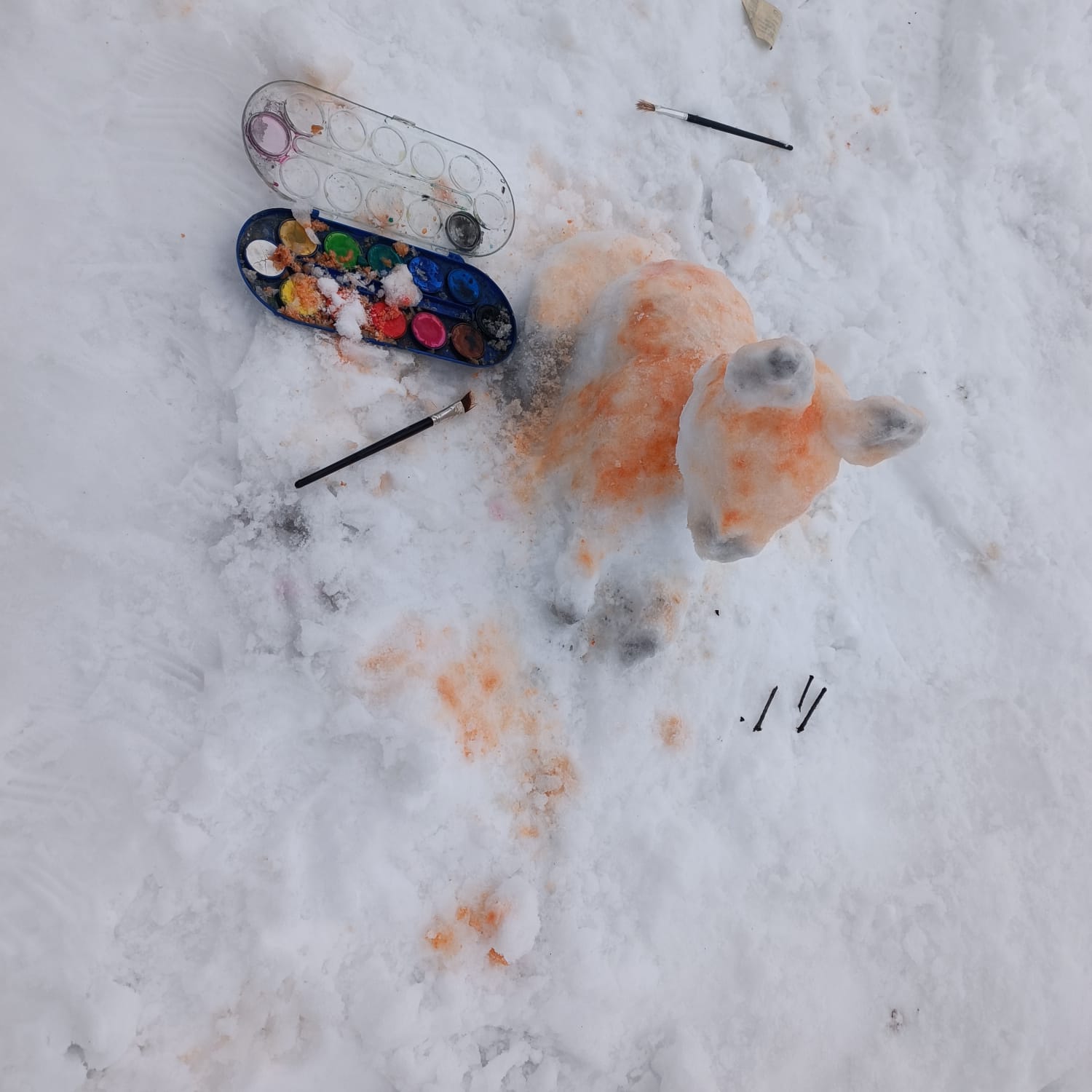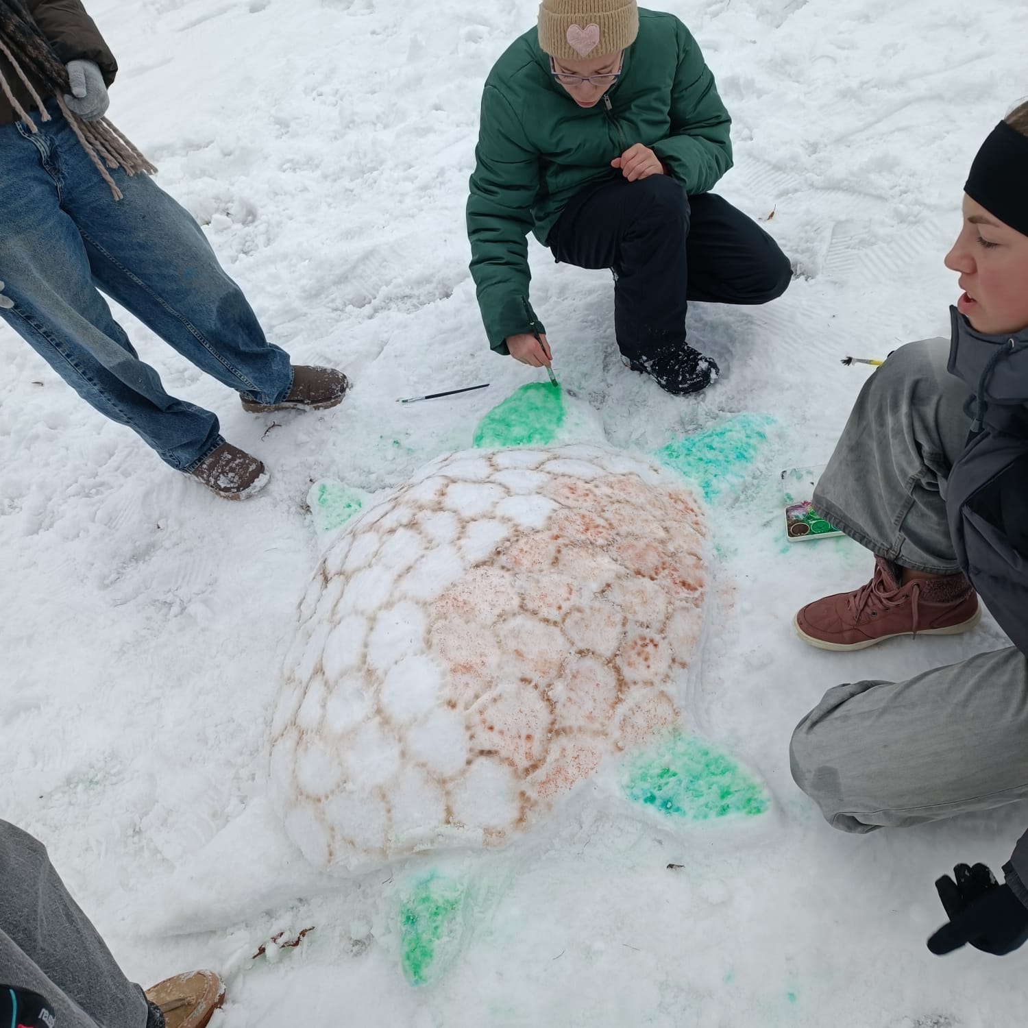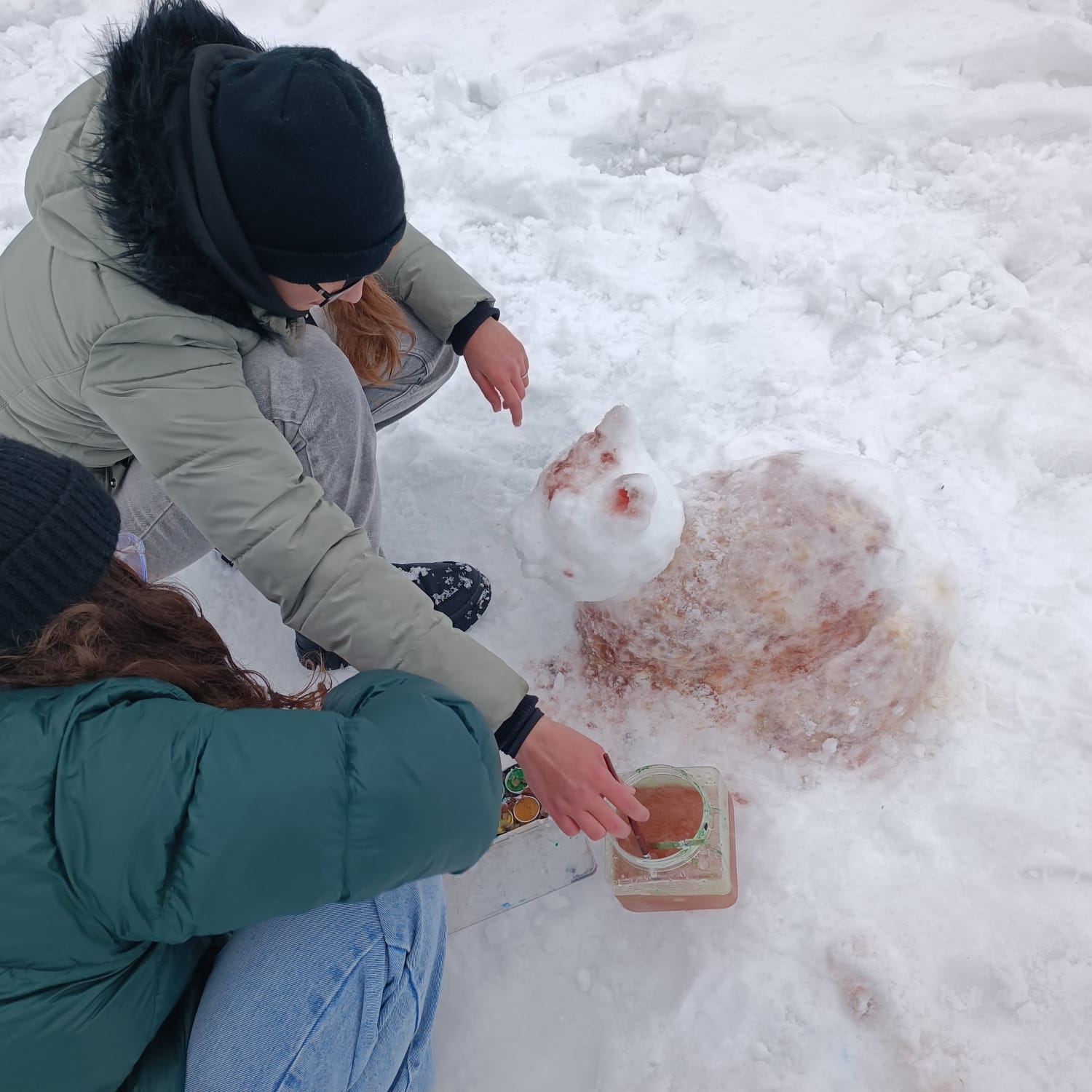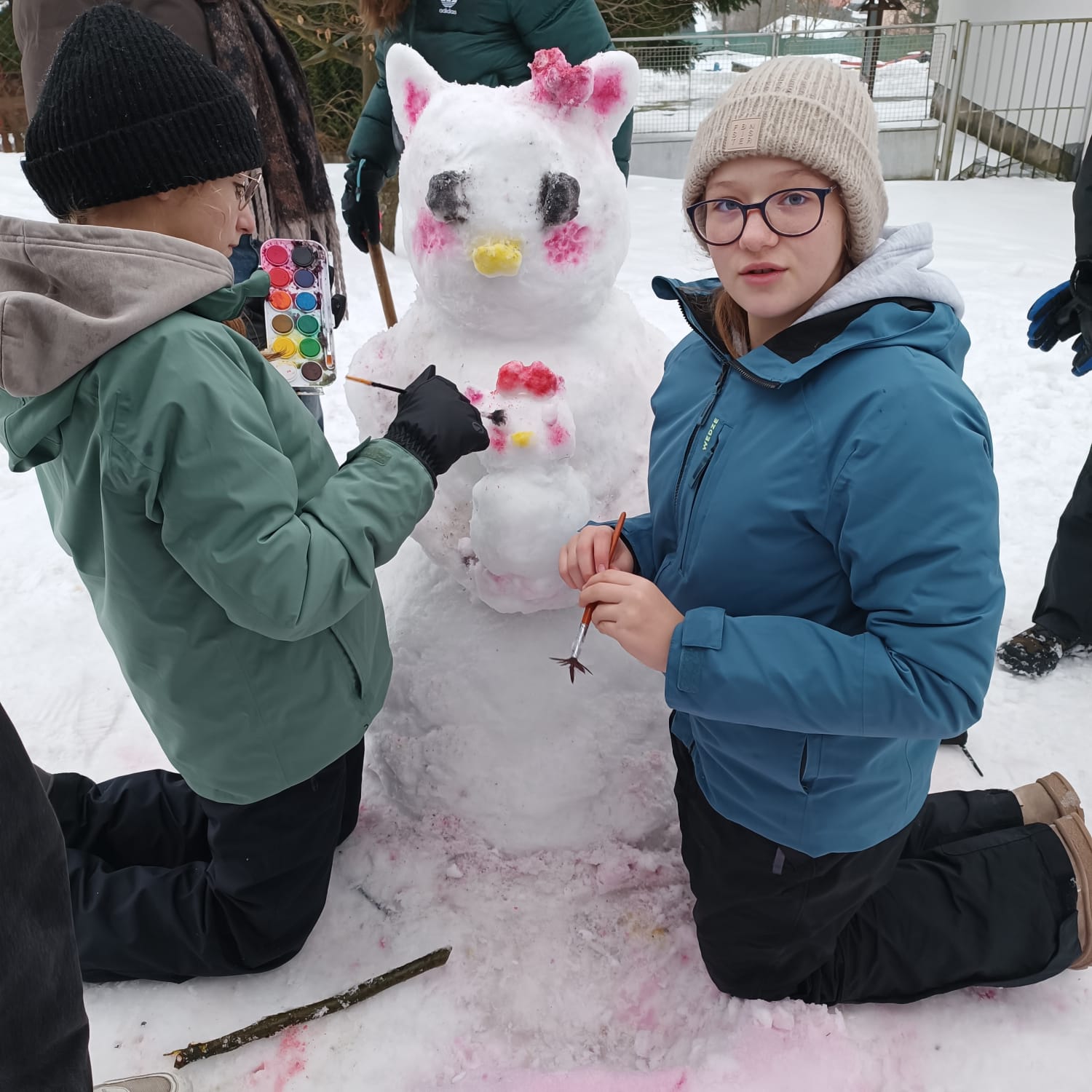 Žáci 7. třídy se v rámci výuky výtvarné výchovy pustili do netradiční výtvarné činnosti v přírodě. Vytvářeli prostorové sochy ze sněhu a následně je domalovali. Žáci samostatně i ve skupinách hledali vlastní výtvarná řešení a učili se reagovat na specifické vlastnosti materiálu.