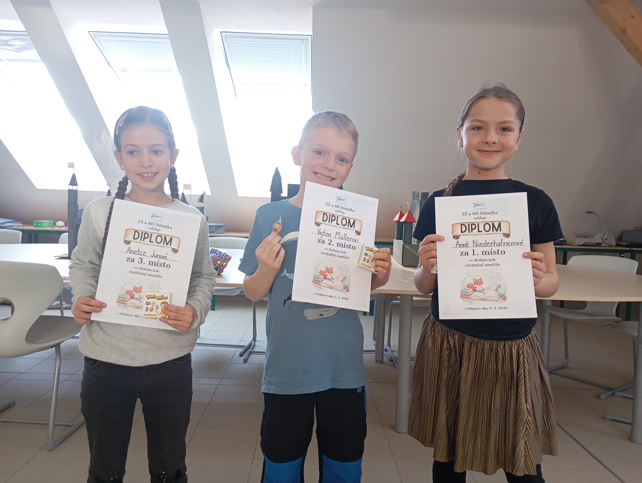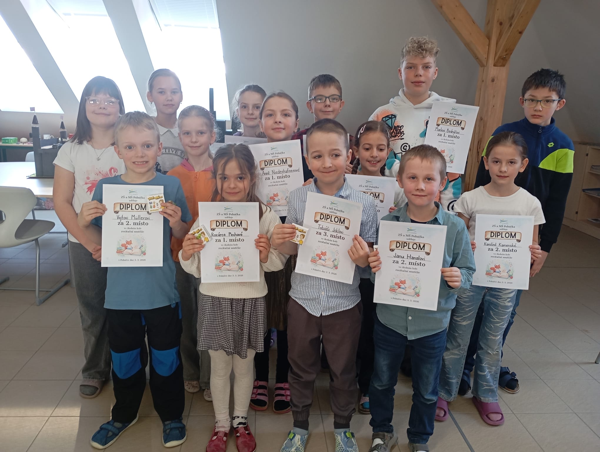 Žáci druhého stupně poté poměřili své dovednosti ve školním kole recitační soutěže. Nechyběla lehká tréma, soustředění ani podpora publika v podobě potlesku spolužáků. Vystupující si vyzkoušeli přednes před ostatními i citlivou práci s textem, což pro mnohé znamenalo cennou zkušenost. Děkujeme všem účastníkům za odvahu vystoupit a věříme, že je tato zkušenost povzbudí k dalšímu rozvíjení jejich vztahu k poezii.
