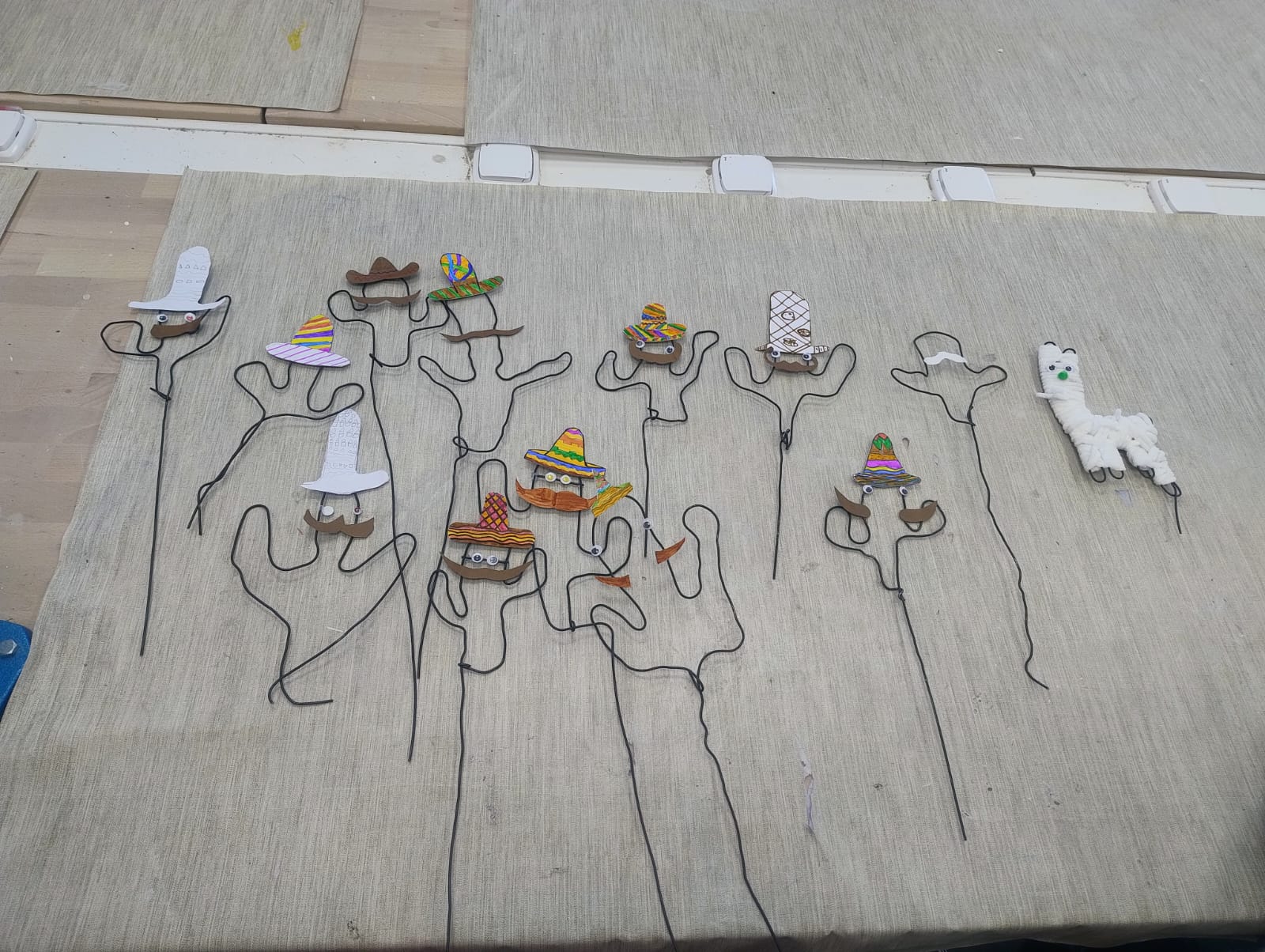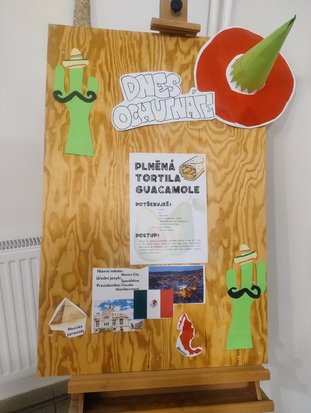 V pondělí jsme měli ve škole možnost zjistit, jaké jsou symboly Mexika. V prostoru u šatny vyrostly kníraté kaktusy, objevily se mexické vlajky a typické klobouky. Sedmáci pak v Sp vyrobili několik drátěných zápichů do květináče.