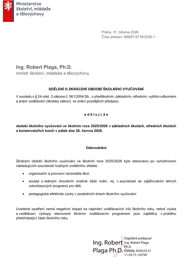 Tímto informujeme žáky i rodičovskou veřejnost, že MŠMT rozhodlo o tom, že tento školní rok bude ukončen již v pátek 26. června 2026.